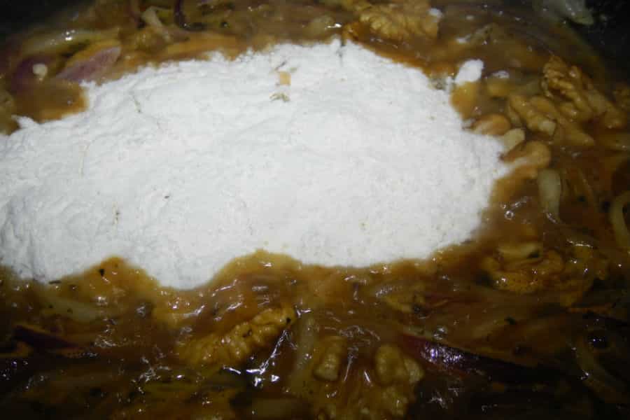 Posteriormente agrega el caldo donde cocinaste las peras y agrega la harina. Mezcla bien hasta que la harina esté totalmente disuelta y espesa.