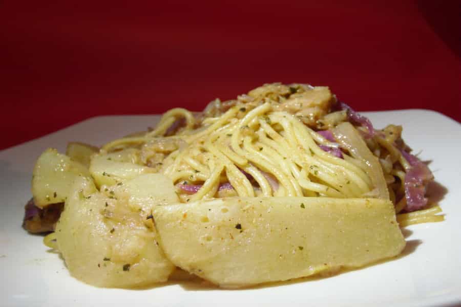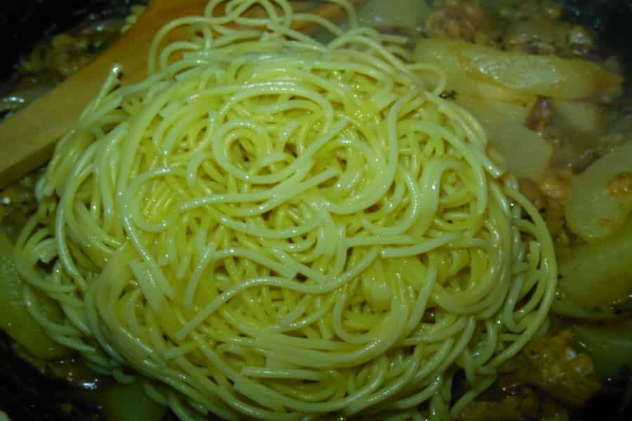 Luego incorpora lentamente los tallarines y revuelve bien.