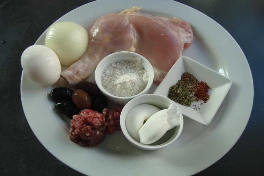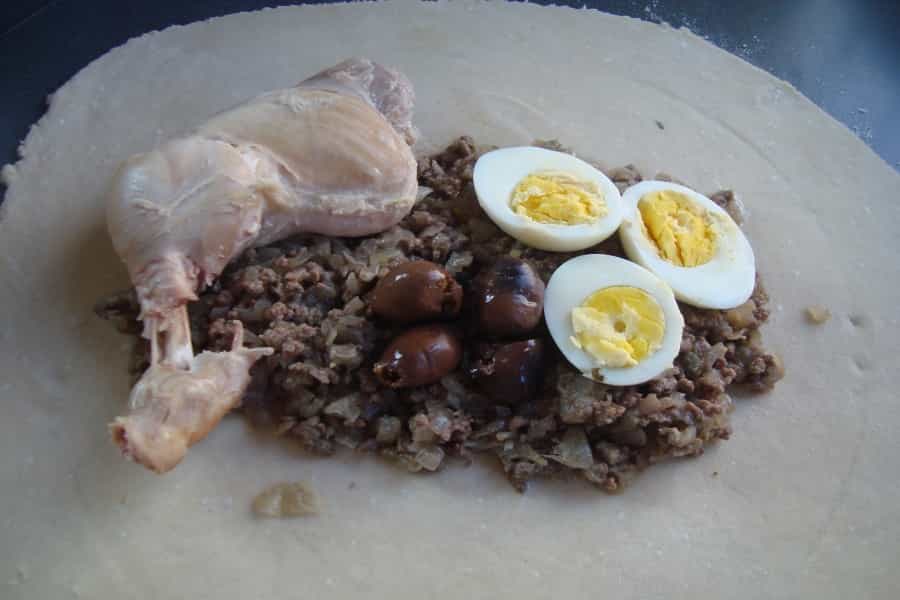 Dividir la masa en 4 porciones, en una mesa enharinada y con ayuda de un uslero estirar la masa en forma de círculo, rellenar cada empanada con ¼ del pino de carne, un trutro de pollo cocido 1 ½ huevo duro y 4 aceitunas.