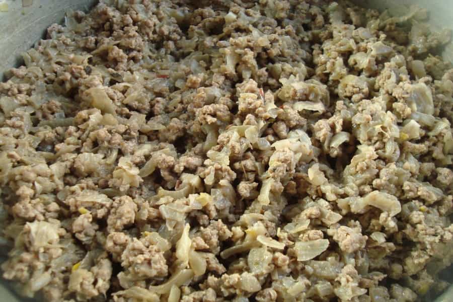 En una olla sin aceite colocar la cebolla pelada y picada en cubos pequeños, cocinar a fuego medio bajo tapado por 25 minutos, ir revolviendo para que no se pegue. Incorporar la carne, orégano, comino, 3 cucharadas de aceite y sazonar a gusto, revolver y cocinar por 20 minutos, destapado. Añadir 2 cucharadas de harina sin polvos de hornear revolver y apagar. Dejar enfriar el pino de carne.