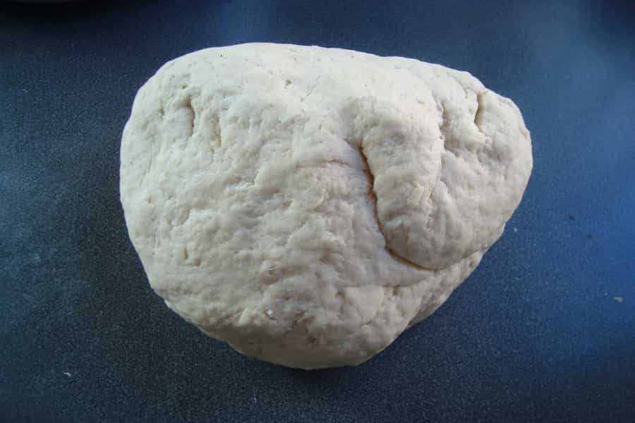 En una mesa limpia mezclar 1 kilo de harina, 1 cucharada de sal y 1 cucharadita de polvos de hornear, añadir la manteca y con ayuda de las manos unir formando una especie de arenado. Verter agua tibia poco a poco, amasar hasta formar una masa lisa y homogénea.