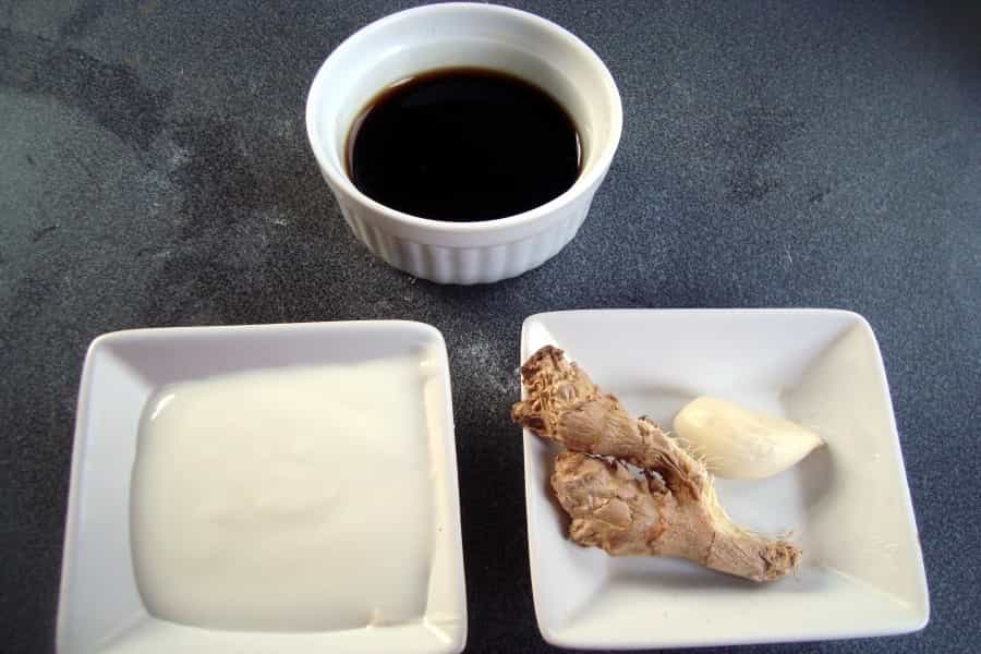 En un recipiente mezclar yogurt natural, los dientes de ajo machacados, jengibre y aceto balsámico, revolver para integrar bien. Rectificar la sazón y servir.