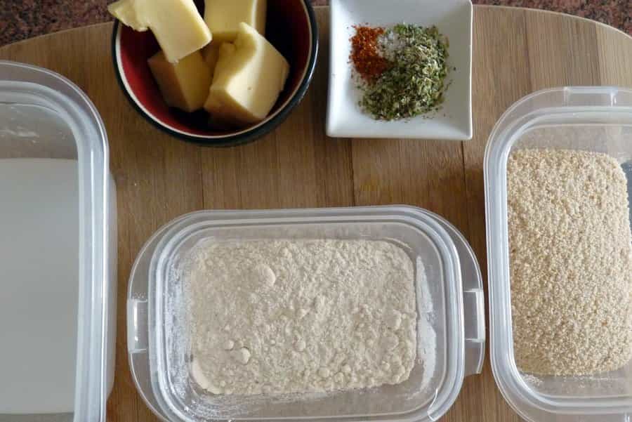 Mantén en recipientes separados el chuño disuelto, pan rallado y harina.