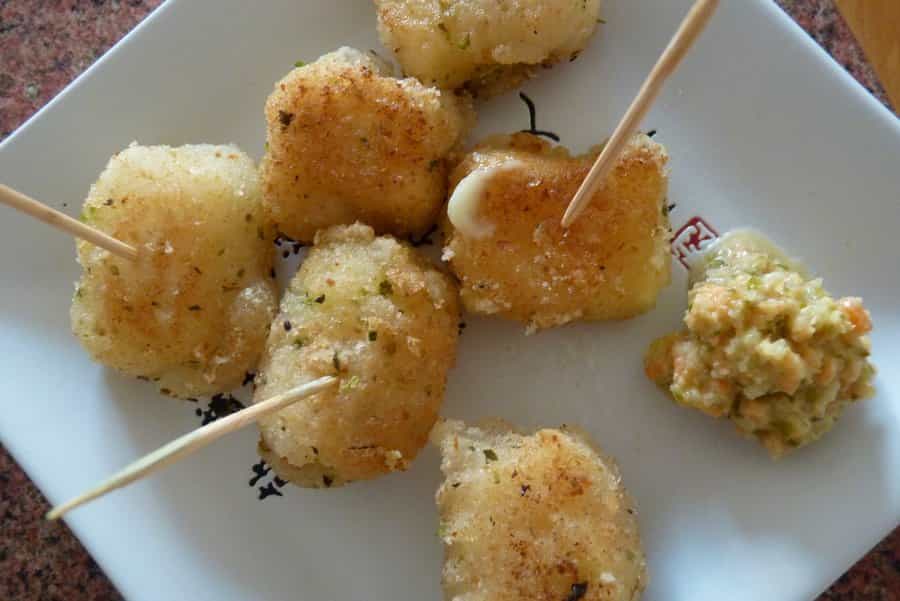 Cada cubito de queso debes pasarlo primero por el chuño disuelto, luego la harina, nuevamente por el chuño y finalmente por el pan rallado con las especias. Este orden es importante, para evitar que el queso se desperdigue al freírlo.
