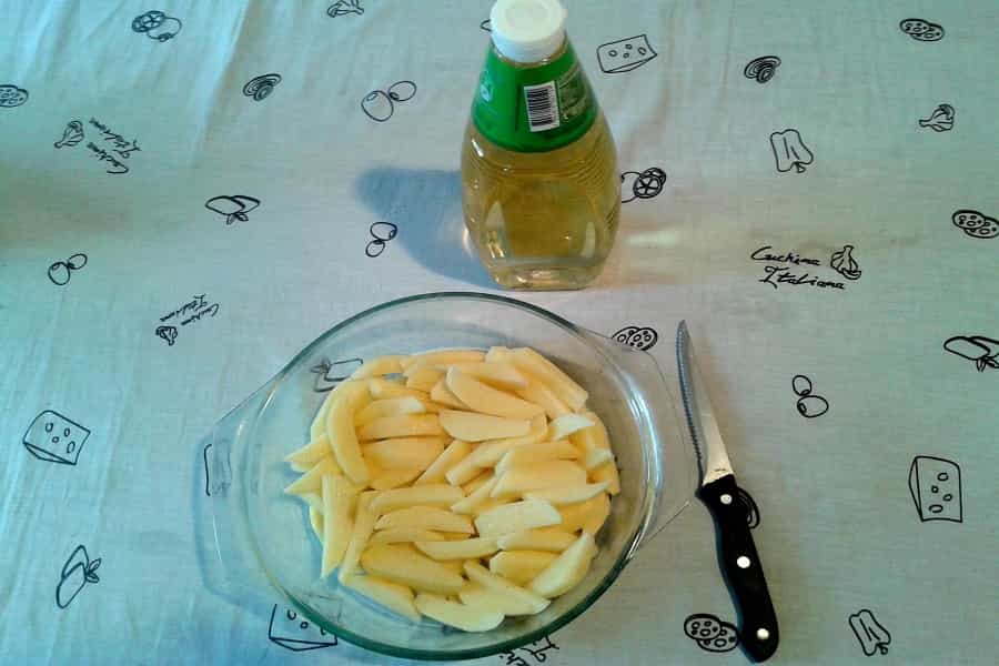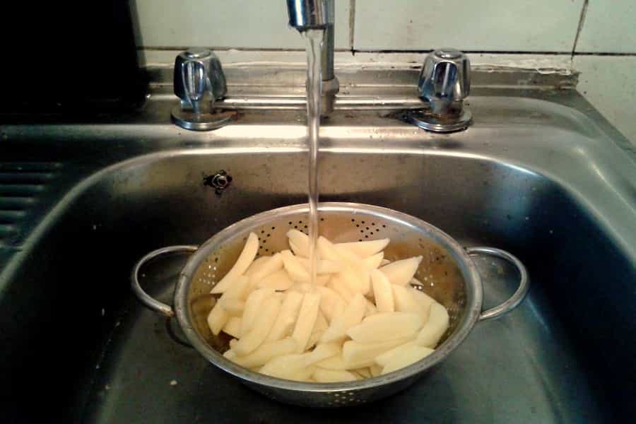 1. Lo primero que haremos, es pelar las 5 papas. Una vez listas, procedemos a lavarlas con bastante agua. La idea, es retirar todo el almidón que la papa expele. Es por esto, que debemos lavar cada papa muy bien, por lo menos, unas cinco veces.