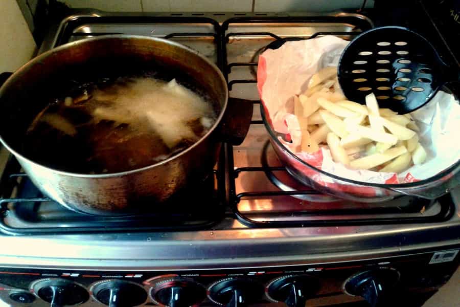 3. Ya realizados estos pasos, podemos proceder a freír las papas. Presta atención en este paso. El aceite debe estar en máxima potencia y bastante caliente. Echamos las papas y evitamos moverlas. La idea, es que no revuelvas a cada rato, esto les quita consistencia a las papas. Pasados 4 minutos, retíralas y déjalas remojar en un recipiente con papel. Luego de 2 minutos, vuelve a freír las papas en el aceite, a máxima potencia. Espera 4 minutos más y retíralas.