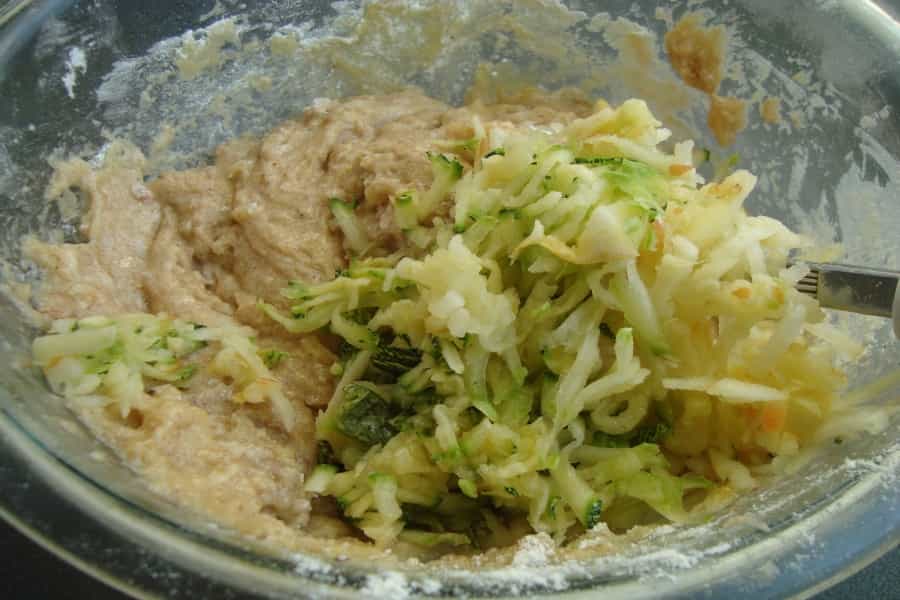 Por último agregar las nueces, manzanas y zucchinis rallados, integrar hasta obtener una mezcla homogénea.