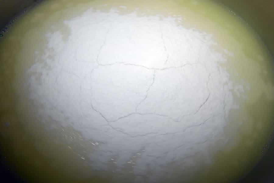Luego agregar la harina previamente cernida. Revolver hasta que espese y enfriar.