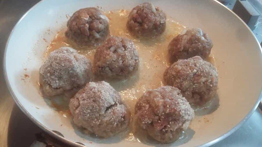 Primero comenzamos haciendo las albóndigas. Para ello mezcla todos los ingredientes en un envase y forma las bolitas. Calienta en un sartén ¼ de taza de aceite y fríe las albóndigas. Que se doren, la idea es sellarlas bien por fuera, porque su cocción interior se hará dentro de la salsa.