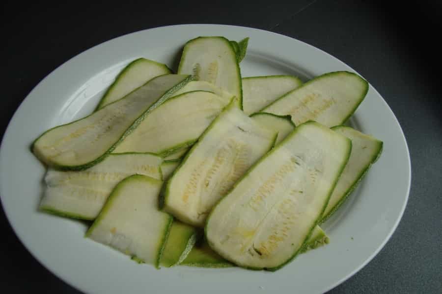 Lavar y cortar los extremos del zucchini. Cortarlo en láminas finas.