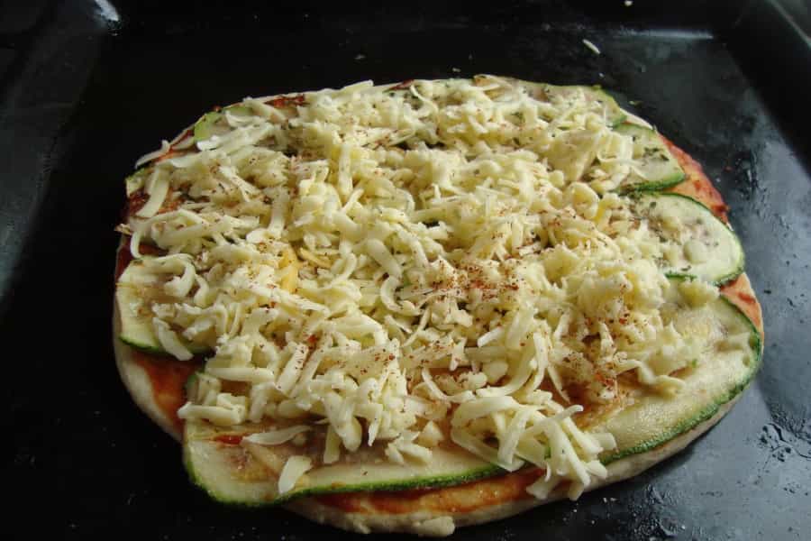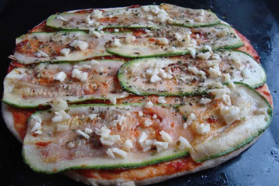 Una vez que la masa este pre-cocida, untarla con salsa de tomates. Luego cubrir la pizza con las laminas de zucchini y los ajos picados finamente. Sazonar con sal, merquén y orégano a gusto.