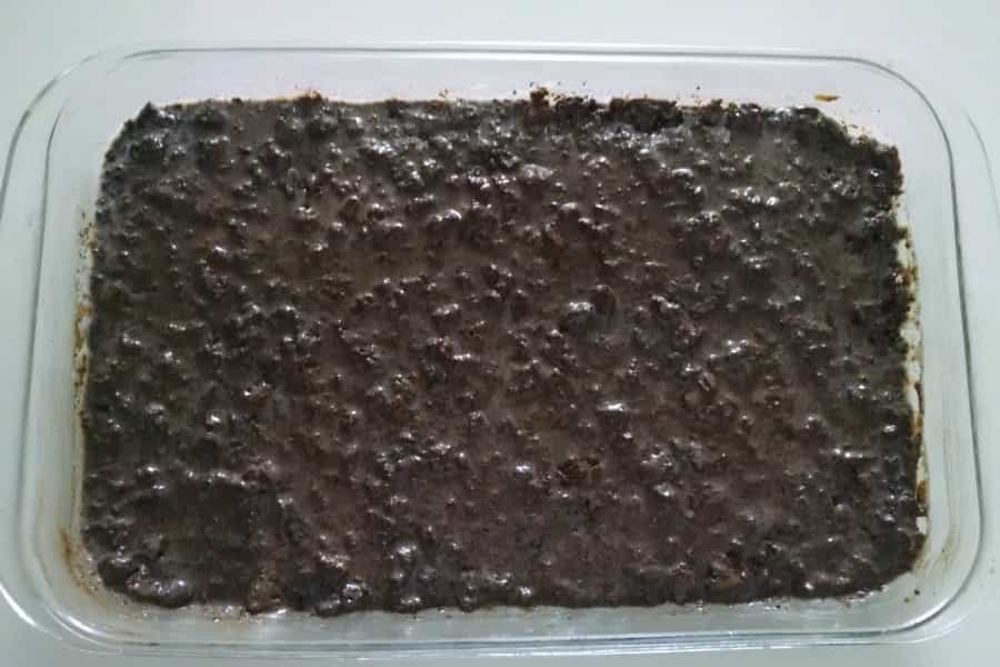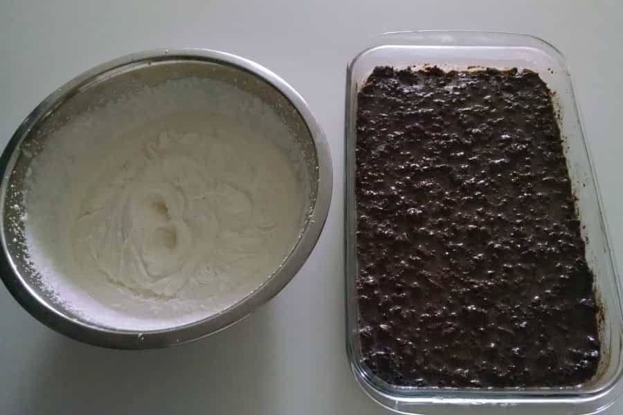 4 Esparcir la crema lista sobre la mezcla de galletas y leche condensada.