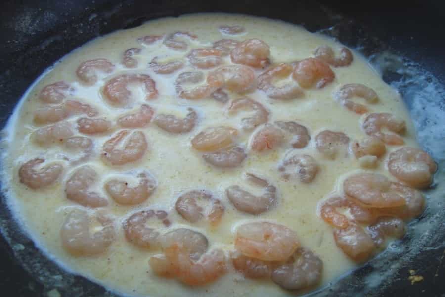 En un sartén con 2 cucharadas de mantequilla caliente, incorporar la harina y sin dejar de revolver agregar 1 taza del caldo de la cocción de los camarones, crema y leche. Salpimentar a gusto y cocinar a fuego bajo por 5 minutos. Incorporar los camarones, cocinar por 1 minuto y apagar.
