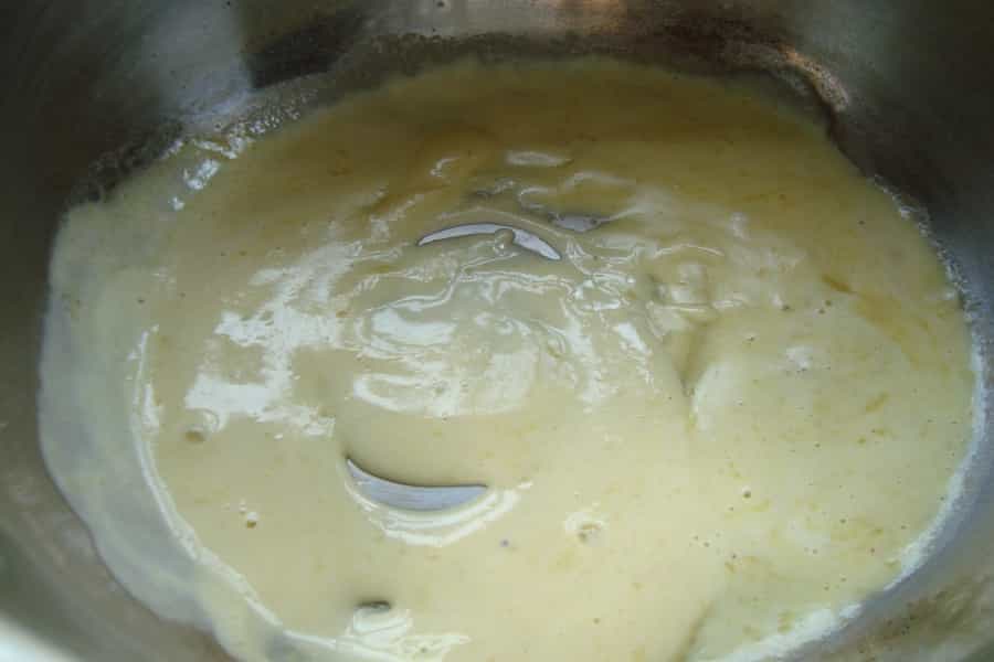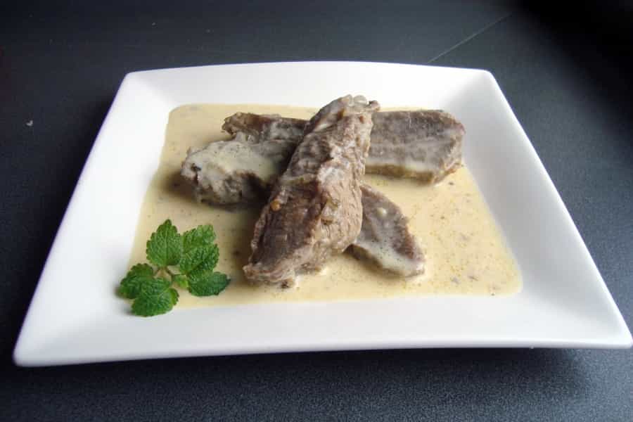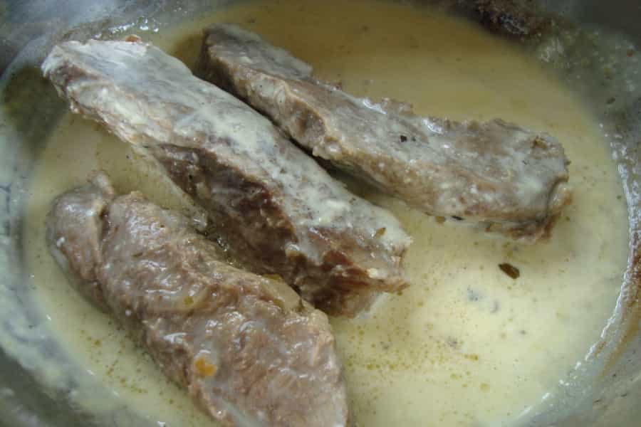 En una olla pequeña, mezclar 2 cucharadas de aceite, mostaza y crema, incorporando un poco de caldo de la cocción de la carne y revolver hasta integrar bien.