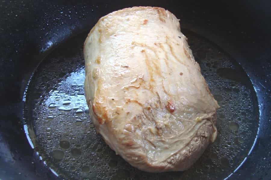 Limpiar la carne eliminando la grasa. Realizar pequeños cortes e introducir los ajos partidos (reservar 1 diente de ajo). En una olla con aceite caliente, sellar la carne dándola vuelta para que se dore por todas partes.