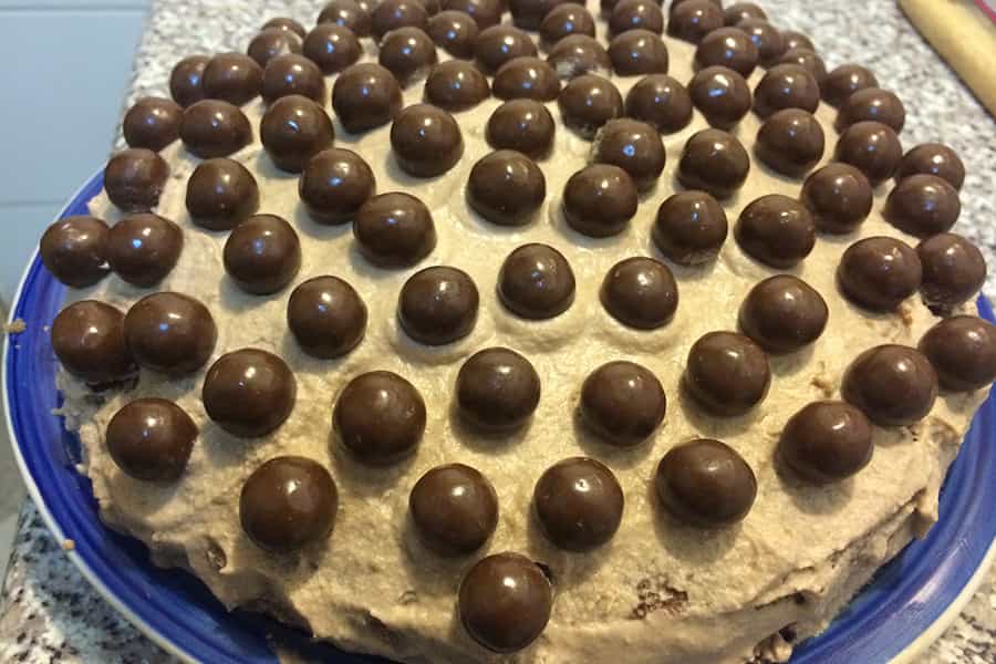 Ponemos la mezcla del relleno en el medio y cerramos nuestra torta para forrarla con la misma mezcla como cobertura. Para decorar, utilizamos los Rolls. ¡Queda increíble!