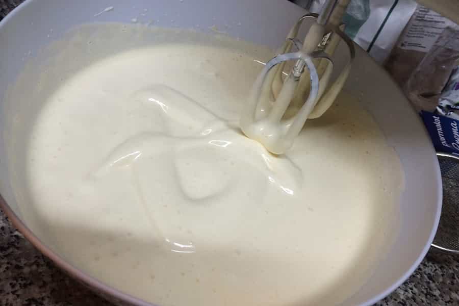 Comenzaremos por lo básico: el bizcocho. Lo primero que debemos hacer es batir los huevos hasta que suban mucho y estén a punto letra. Para eso, batiremos 5 minutos, añadiremos el azúcar en tres tandas y continuaremos batiendo. Una vez que hagamos letras con la mezcla y éstas se mantengan al menos por 5 segundos, llegaremos a la consistencia que queríamos. Ponemos a calentar nuestro horno a 180 grados.