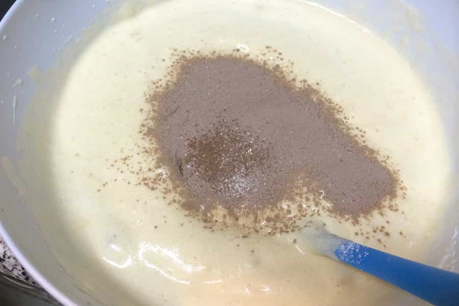 Luego, es turno del chocolate, pero sólo utilizaremos la mitad en esta ocasión. También tamizamos y mezclamos, sin revolver fuerte para no perder el aire obtenido en el batido.