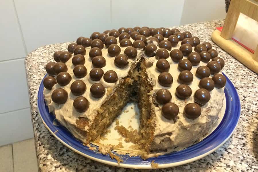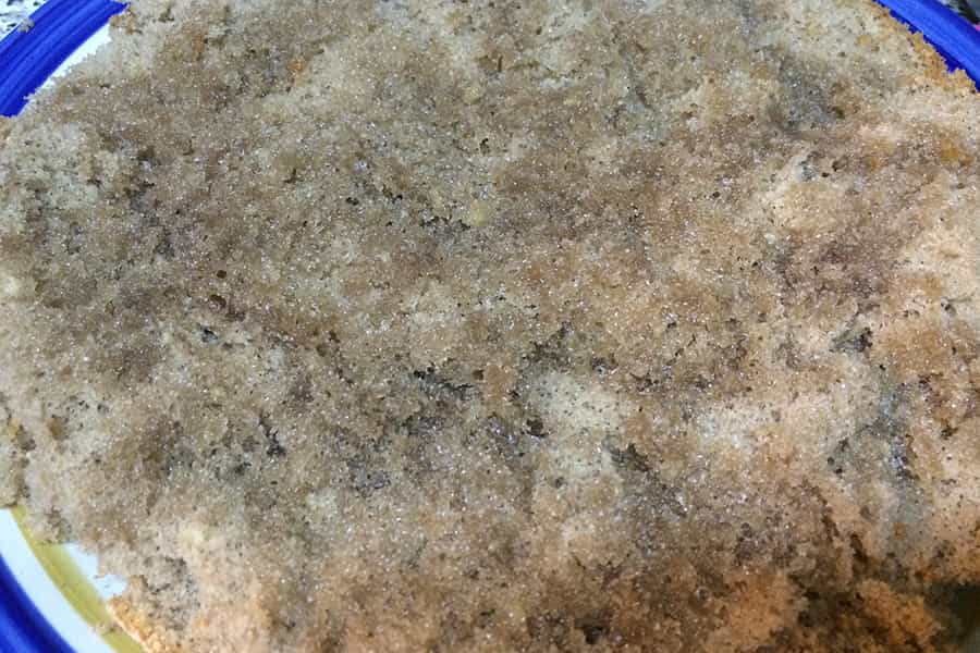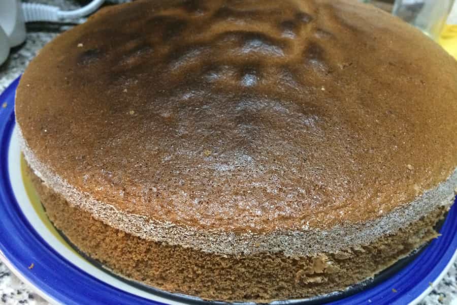 En un molde enharinado colocamos nuestra mezcla y la llevamos al horno por aproximadamente 20 minutos. El tiempo dependerá del horno y de muchas otras circunstancias, por lo que es importante estar atentas. Una vez que veamos los bordes dorados, el bizcocho estará listo. No se preocupen por la harina que pueda haberse pegado del molde: sale fácilmente con pequeños toques.