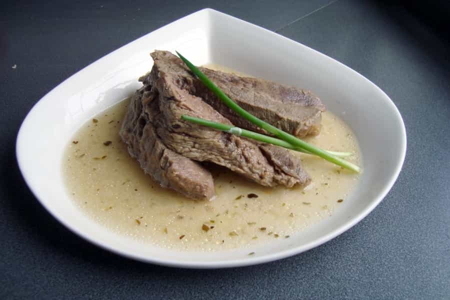 Rectificar la sazón y cocinar a fuego medio 40 minutos, cortar la carne en trozos y seguir la cocción hasta que la carne este blanda. (Si fuese necesario puedes ir agregando más liquido). Apagar y servir la carne mechada al cognac con su jugo acompañada de papas, ensalada o arroz.