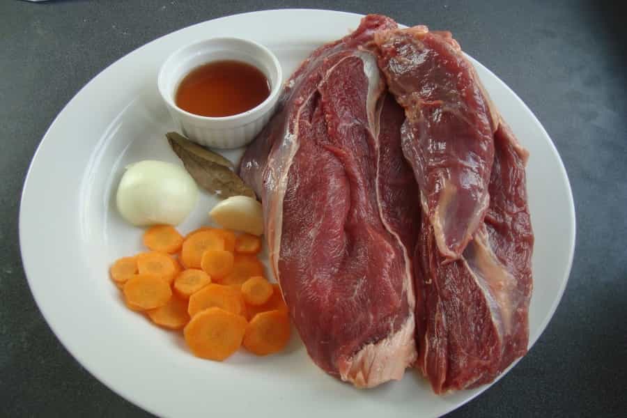 Mechar la carne, para esto hacer pequeños cortes e introducir pedazos de zanahoria y trozos de ajo. En una olla con 2 cucharadas de aceite caliente, sellarla girándola (sin pincharla) para que dore en todas sus partes. Retirar la carne de la olla, añadir 2 cucharadas de aceite y cuando éste se encuentre caliente, incorporar 1 cebolla picada en cubos, 1 diente de ajo picado, zanahoria cortada en rodajas, orégano, laurel y salpimentar a gusto.