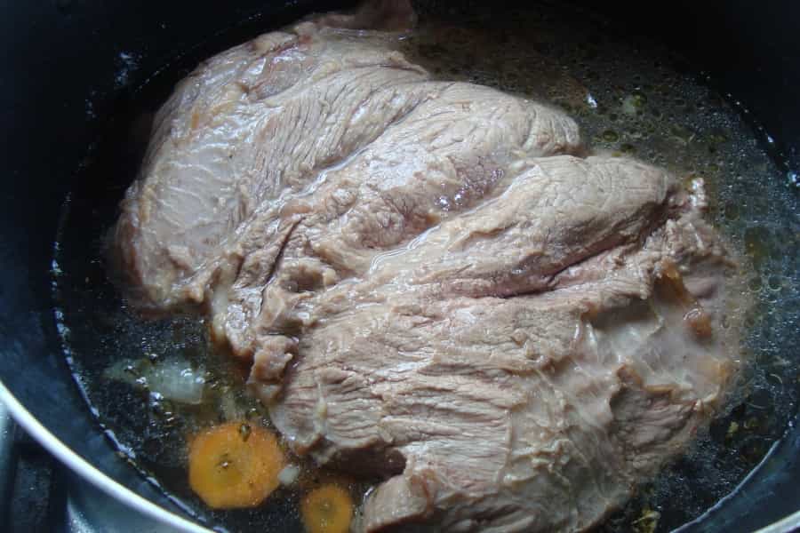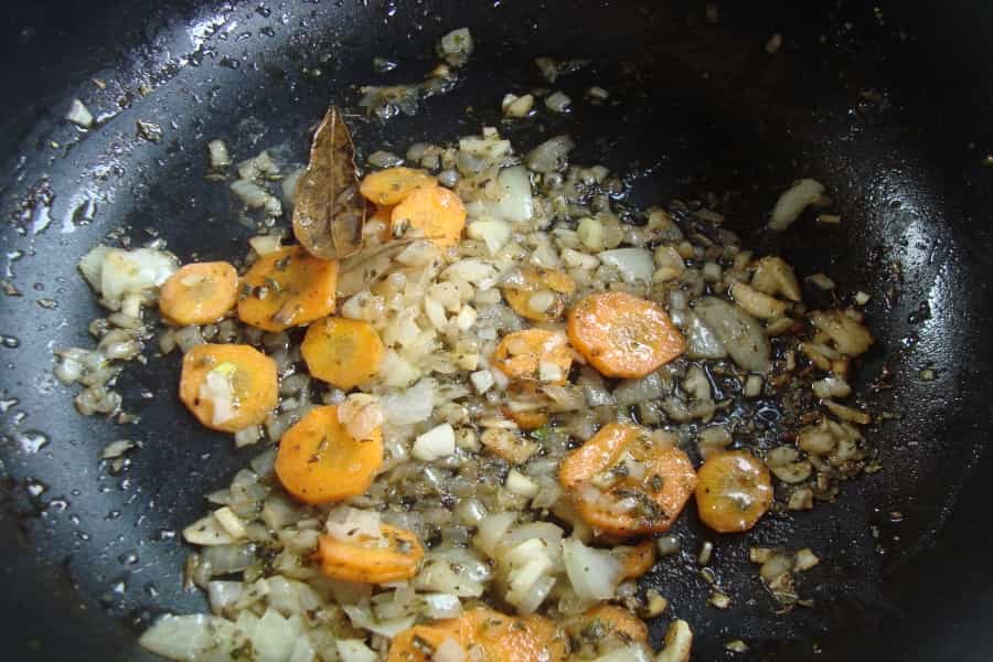 Sofreír a fuego medio por 3 minutos. Retirar la olla del fuego y verter el cognac; volver a colocar la olla al fuego, añadiendo la carne sellada y un litro de agua tibia o caldo.