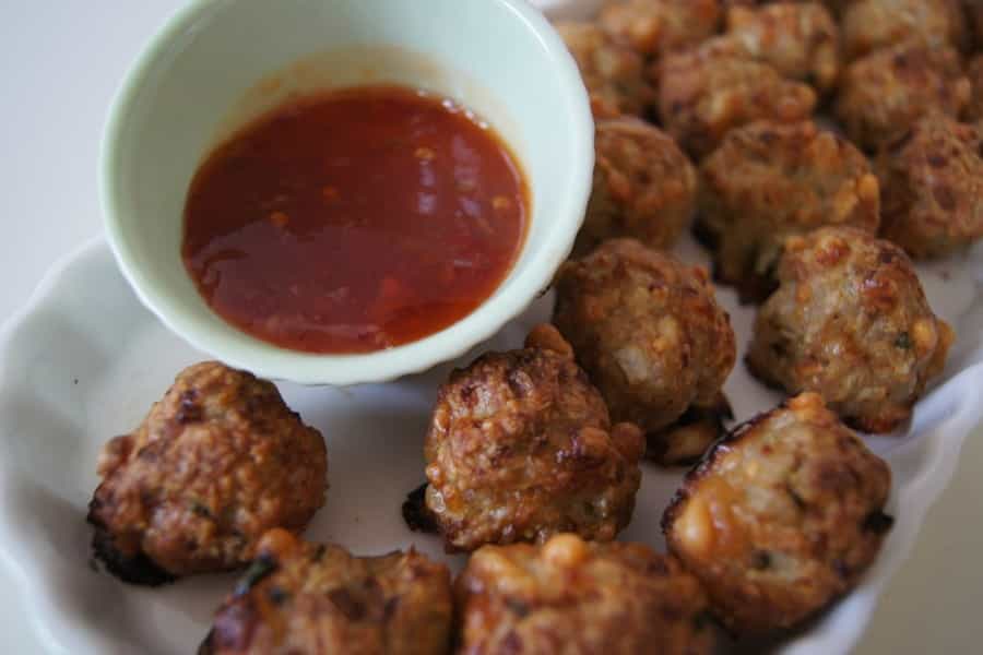 3.Arma los popietines del tamaño de una nuez, pásalos por harina y colócalos en una fuente enmantequillada. Agrega el almidón de maíz disuelto en el caldo y el puré de tomates. Cubre.