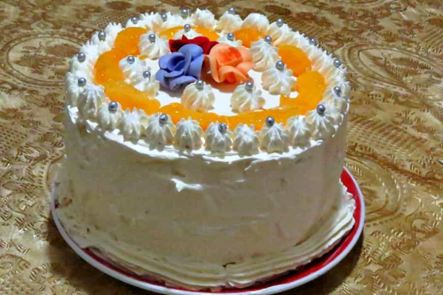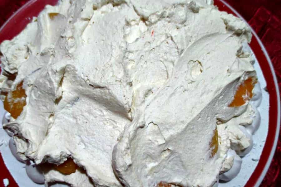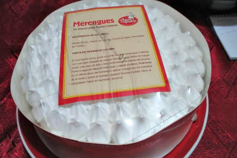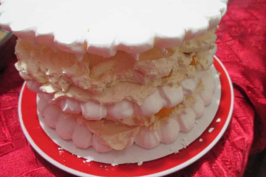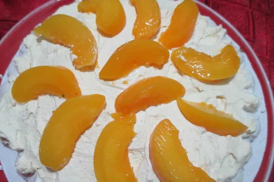 Cubre un disco de merengue con el batido resultante. Pon encima los duraznos en rodaja y luego, otra porción de crema. Tapa con el segundo disco, repitiendo la operación.