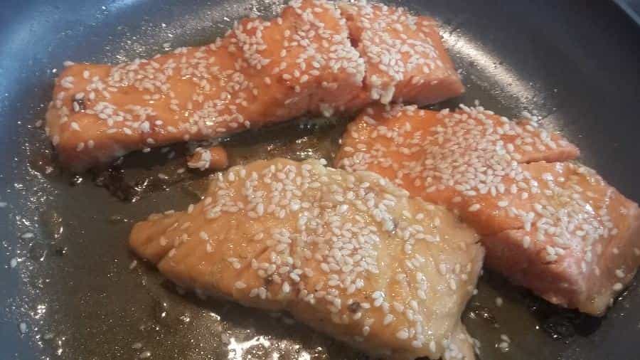 Cuando estén a punto, agrega la miel sobre los medallones de salmón y continúa cocinando. Ahí se dorarán un poco más por 5 minutos. Agrega las semillas de sésamo.