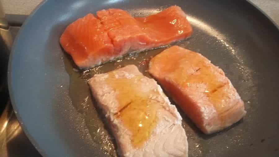 En un sartén, coloca el aceite de oliva a calentar a fuego medio. Agrega el salmón y ve dándole vueltas de manera constante, con el fin que se dore pero que no se re- cocine por dentro.