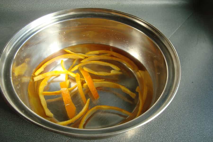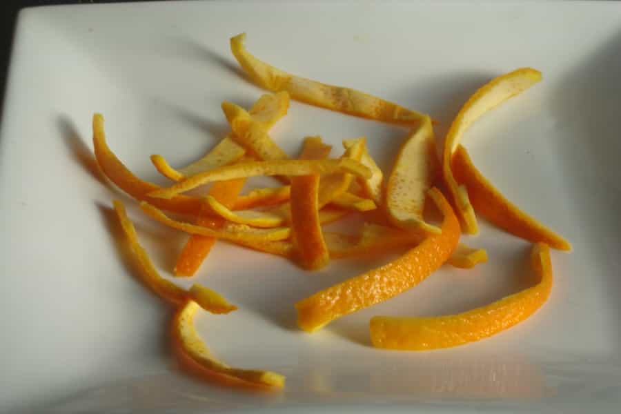 Con ayuda de un cuchillo, eliminar la parte blanca de la cáscara. En una olla con agua fría, cocinar las cáscaras y dejar hervir por 5 minutos. Escurrir, eliminar el líquido de la olla y repetir la operación de cocción 3 veces.