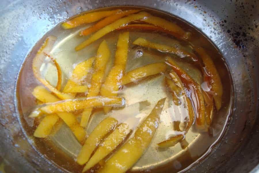 En una olla mezclar azúcar y 250 mililitros (ml) de agua. Cocinar a fuego medio por 15 a 20 minutos hasta formar un almíbar. Colocar las cascaras de naranja en el almibar y cocinar a fuego medio por 10 minutos.