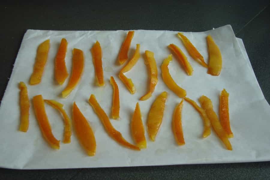 Traspasar las cáscaras de naranja en almíbar a un papel mantequilla; dejar enfriar. Luego, pasarlas por azúcar y reservar.