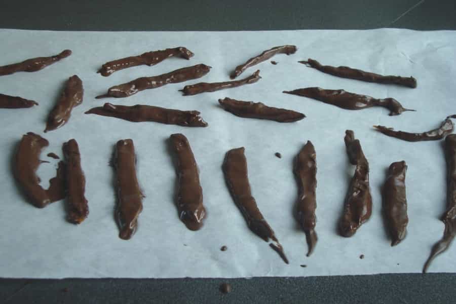 Derretir el chocolate a baño maría o en el microondas. Bañar las naranjas en el chocolate, traspasar a un papel mantequilla y dejar enfriar. Una vez que estén frías, las cáscaras de naranja en chocolate estarán listas para servir.