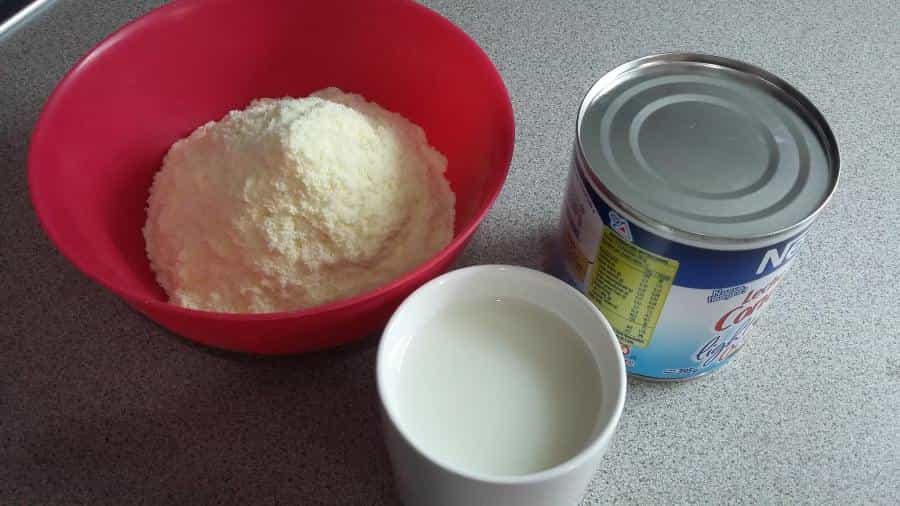 Mezcla la leche en polvo con la leche condensada. Agrega poco a poco la leche líquida, hasta formar una pasta firme pero suave.