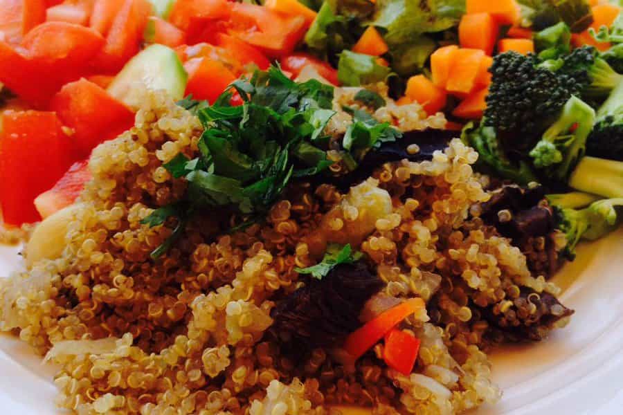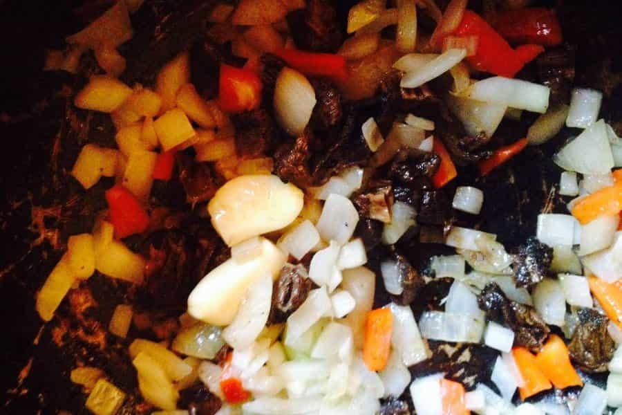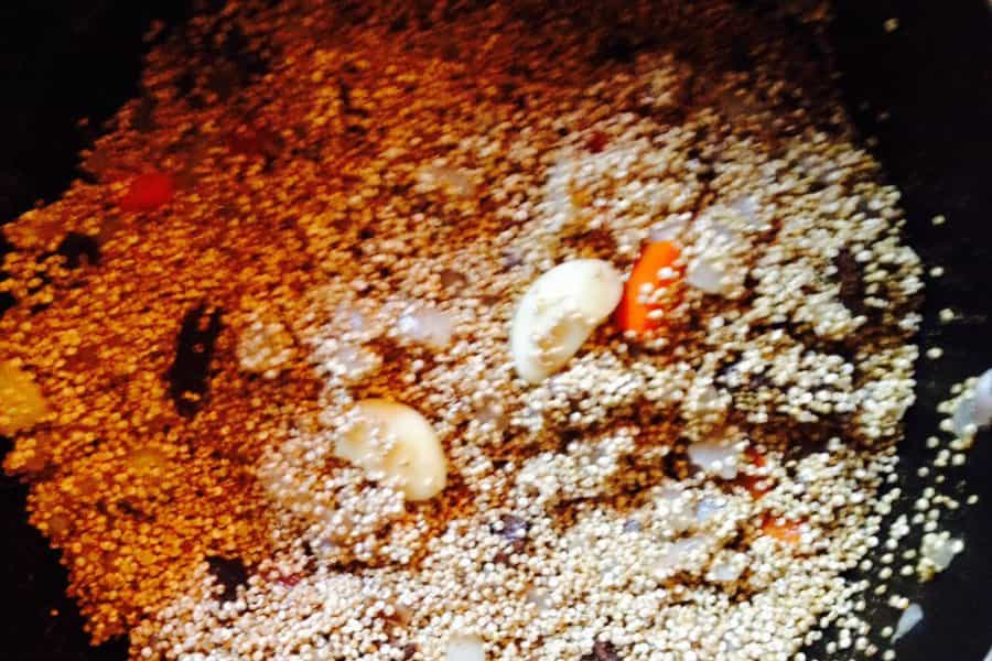 - Sofríe la cebolla, pimentón, los dientes de ajo y las callampas; luego agrega la taza de quinoa, incorpora todo.