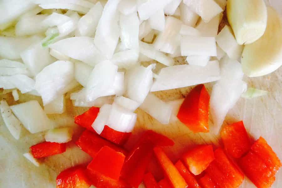 - Pica la cebolla, el pimentón y los dientes de ajo