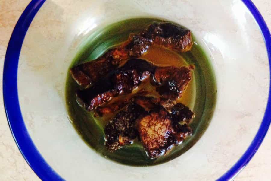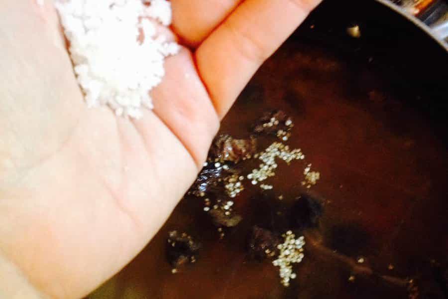 - Añade 2 tazas de agua caliente con sal (incluida el agua donde remojaste las callampas).