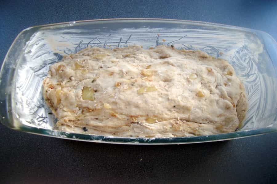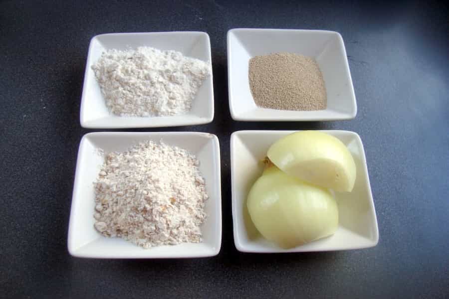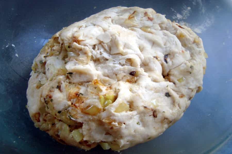 En un recipiente mezclar harina integral, harina común, levadura, ½ cucharada de sal y 3 cucharadas de aceite de oliva. Añadir poco a poco 500 mililitros de agua tibia y con ayuda de una cuchara de madera, incorporar todos los ingredientes. Amasar hasta formar una masa homogénea (si fuese necesario puedes agregar más agua). La mezcla debe quedar un poco seca. Dejarla reposar tapada con un paño limpio en un lugar cálido por 1 hora. Transcurrido el tiempo de reposo, traspasar la masa a una mesa limpia enharinada y amasar por 3 minutos. Con ayuda de las manos, formar un bollo grande y hacer un orificio al centro. Añadir las cebollas caramelizadas frías, amasar hasta integrar bien.