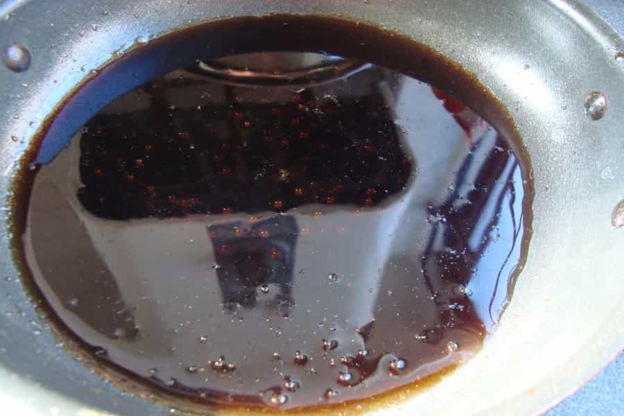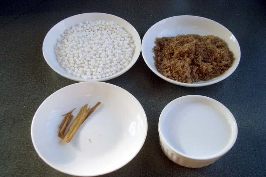 En una olla pequeña derretir a fuego lento la chancaca o azúcar de palma o azúcar morena, mezclada con 3 cucharadas de agua fría. Este proceso demora aproximadamente 5 minutos. Dejar enfriar y reservar. A esta preparación se le llama: Gula Melaka.