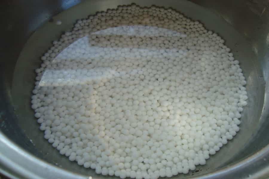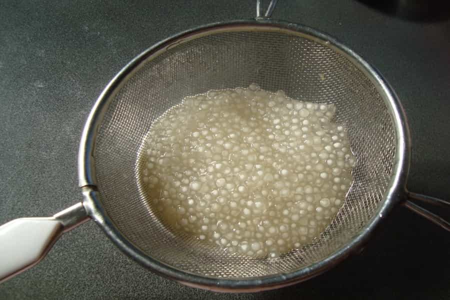En una olla con 700 mililitros de agua, cocinar a fuego medio las perlas de sagú o tapioca, revolver constantemente para que las perlas no se peguen. Cocinar por 15 minutos o hasta que la tapioca se torne transparente.