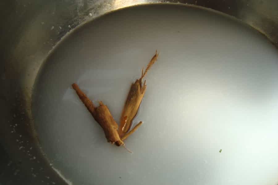 En una olla, cocinar a fuego medio la leche de coco y canela. Revolver constantemente. Una vez que hierva y haga burbujas, apagar. Dejar enfriar y reservar la crema de coco.