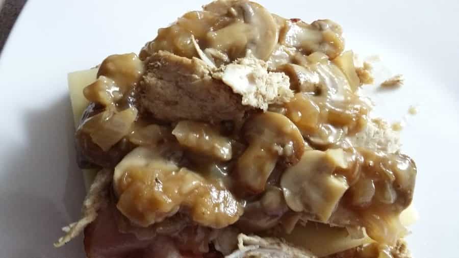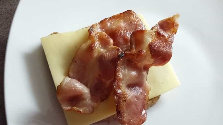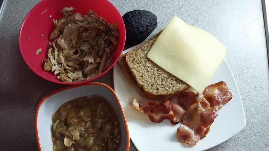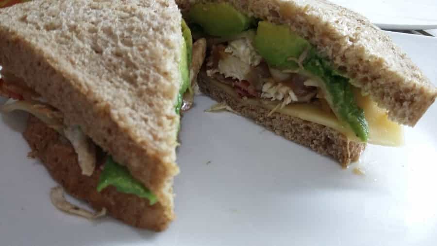 Para el sándwich, coloca el queso y la tocineta, luego el pollo desmenuzado y la crema de champiñones. Finalmente coloca otra lonja de queso y ponlo al microondas por 20 segundos para que se derrita el queso y posteriormente coloca la otra de pan previamente untado con palta.