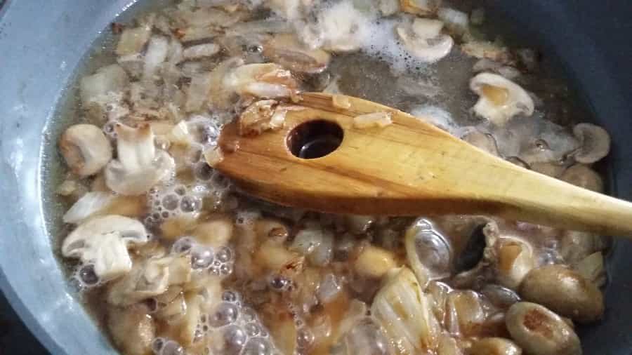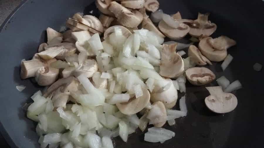 Primero hacer la crema de champiñones, para ello corta en cuadritos pequeños ¼ de cebolla y los champiñones en rodajas. Coloca todo en una sartén con un chorrito de aceite y espera a que todo se dore.