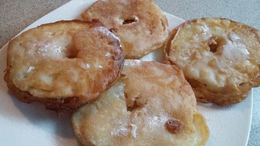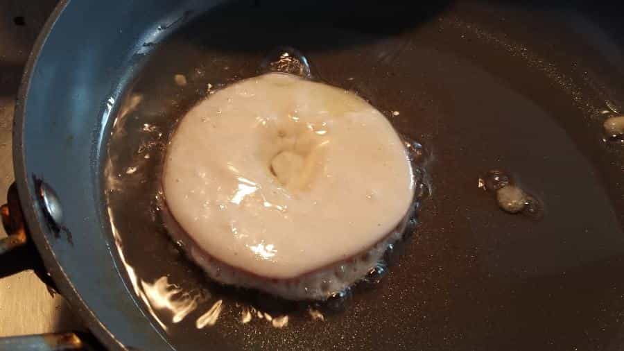 Pasa las rodajas de manzana por el batido y fríe en aceite bien caliente.