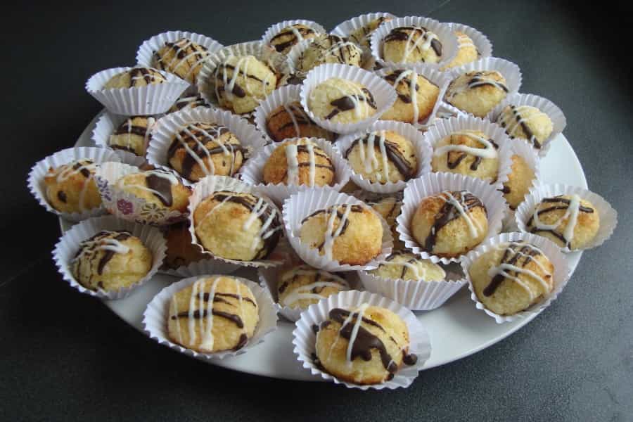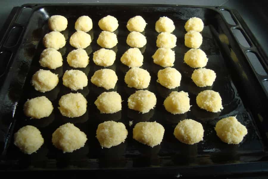 Hornear en horno precalentado por 10 a 15 minutos, deben estar levemente dorados en su superficie. Retirar del horno, dejar que se enfríen en la lata para luego sacarlos. Decorar los bombones de coco nuez y colocarlos en capsulas de papel o pirotines.