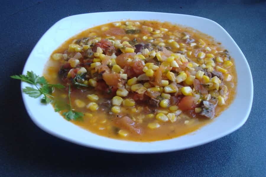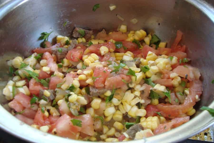 Incorporar el tomate pelado y picado en cubos, albahaca o perejil picado y el choclo picado o en grano. En este paso puedes incorporar las papas peladas y cortadas en cubos. Incorporar ½ taza de caldo o agua y cocinar a fuego medio por 15 a 20 minutos.