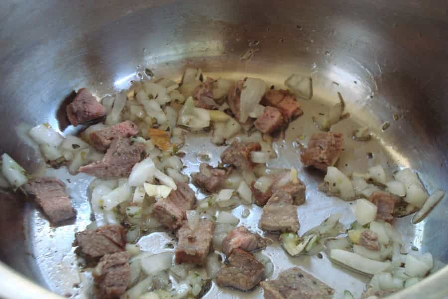 En una olla con 2 cucharadas de aceite de oliva caliente, sofreír por 2 minutos la cebolla picada (puede ser en corte pluma o en cuadritos). Añadir el diente de ajo picado y la carne picada en trozos pequeños, sazonar con sal, merquén y orégano, revolver y cocinar por 5 minutos.