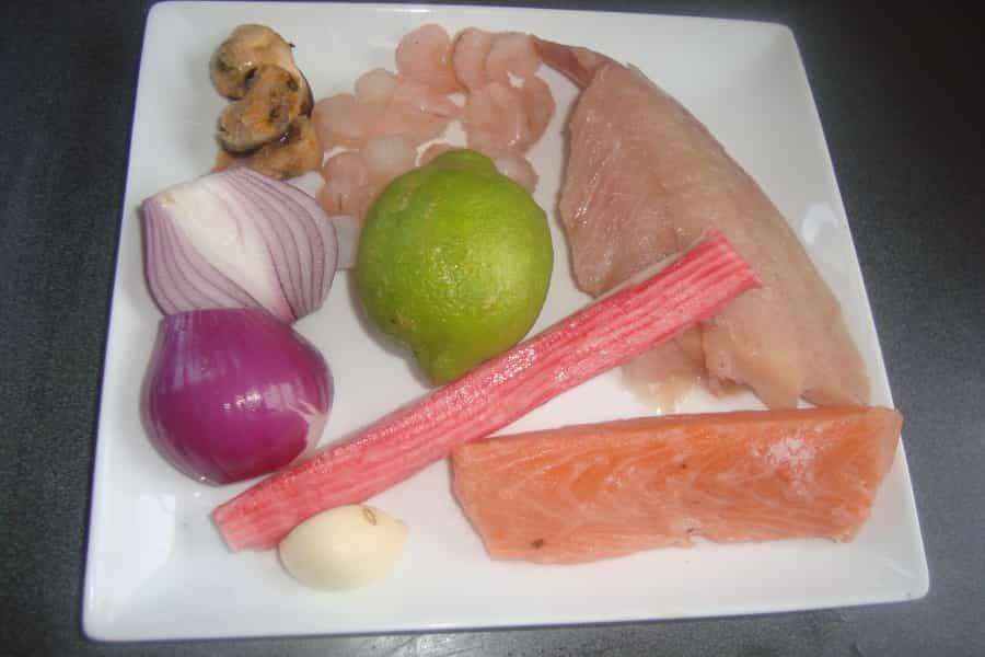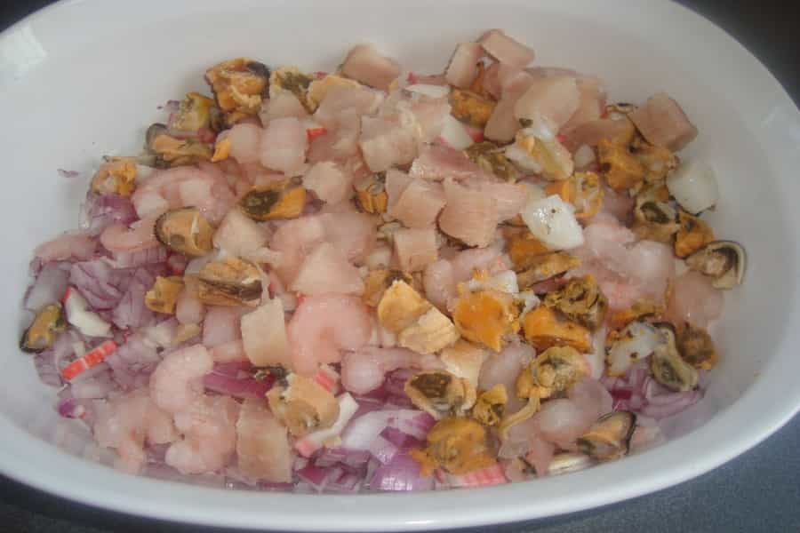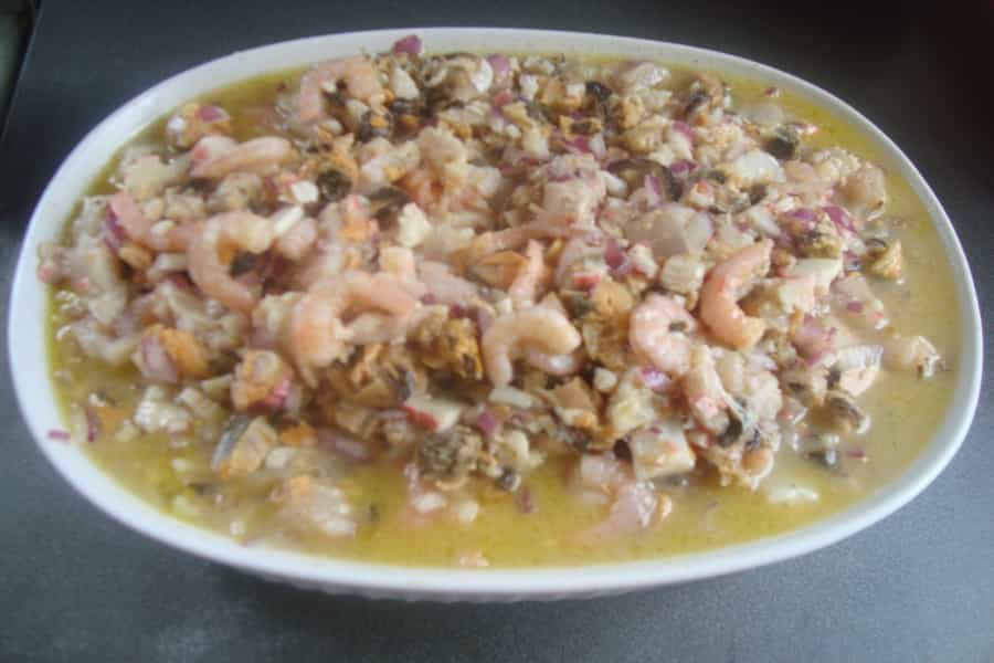 Nota: es aconsejable cocer los mariscos (frescos o congelados) en abundante agua caliente, dejándolos hervir por 5 minutos. Apagar, escurrir y dejar enfriar.