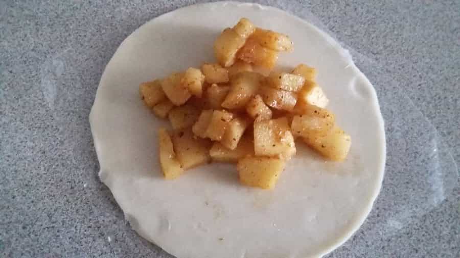 Rellena cada lámina de masa para empanadas con una cucharada de manzanas. Ciérralas con la ayuda de un tenedor y colócalas al horno por 15 minutos a 180°C.